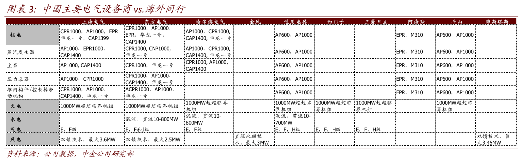 從國內(nèi)的主要設(shè)備企業(yè)與海外同業(yè)對(duì)比來看,除了燃?xì)鈾C(jī)和海上風(fēng)電之外,中國電氣設(shè)備企業(yè)已經(jīng)覆蓋了最先進(jìn)的發(fā)電技術(shù),而且在核電產(chǎn)品類型上更加齊全。