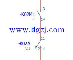 一個(gè)接觸器和一個(gè)繼電器的輔助觸點(diǎn)的連接點(diǎn)13/14以及11/12/14均被標(biāo)識在圖紙中,而實(shí)際的接線也是完全和它對應(yīng)的,譬如實(shí)物中的K02M1接觸器的14號連接點(diǎn)和K02A的11號連接點(diǎn)相連,而日系和國內(nèi)的很多畫法則是在圖紙中把連接點(diǎn)省略,在實(shí)際配盤時(shí),電工根據(jù)自己的意愿查找空閑輔助觸點(diǎn)來接線。
