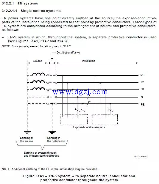 這個(gè)接地系統(tǒng)叫做TN-S。根據(jù)前面的解釋,我們知道T表示變壓器中性點(diǎn)直接工作接地,而負(fù)載的外殼則與來自電源的保護(hù)線相接。