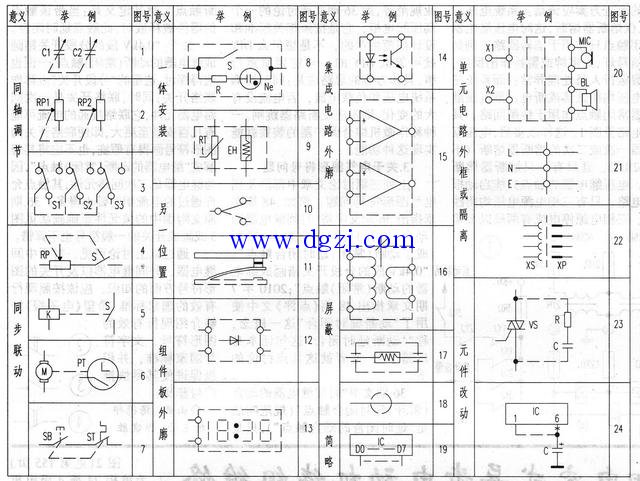 一般作集成電路內部結構圖的邊框,而集成電路的圖形符號(不含內部結構)只需用細實線或粗實線畫出。圖號14表示光耦合器,圖號15表示雙運放或電壓比較器。