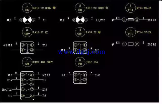 電氣接線圖識(shí)圖方法講解 1.首先對照原理圖上的元件,在這張圖上找到對應(yīng)的元件(兩者元件代號(hào)是一樣的) 2.了解清楚每個(gè)元件的構(gòu)造,即這個(gè)元件的常開/常閉觸頭數(shù)量,原理圖里用到了幾個(gè)。 3.接線圖里把每個(gè)引線去向和線號(hào)都表明了,比如1號(hào)元件(HG)的右側(cè)注明2:1,表示導(dǎo)線去向是2號(hào)元件(HR)的接線端子1