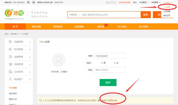 1注冊成功后,登錄橙電網(wǎng)站,點擊右上角“個人中心”,進入個人中心界面,點擊右側(cè)“企業(yè)認證”鏈接