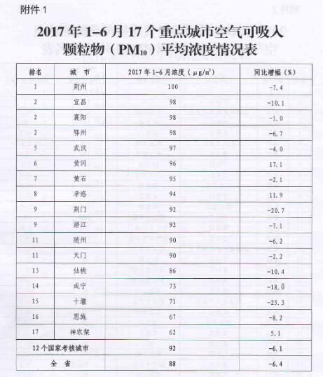 2017年1-6月,全省17個(gè)重點(diǎn)城市可吸入顆粒物(PM10)累計(jì)平均濃度為88μg/m3,同比下降6.4%;納入國(guó)家考核范圍的12個(gè)城市PM10平均濃度為92μg/m3,同比下降6.1%。PM10累計(jì)均值由高到低排序,排名前5的地方依次為:荊州、宜昌、襄陽(yáng)(并列第二)、鄂州(并列第二)、武漢。詳細(xì)情況見(jiàn)附件1。