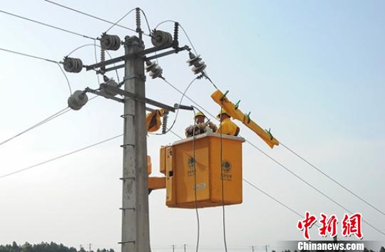 電力搶修人員冒高溫天氣搶修線路。黃崢攝