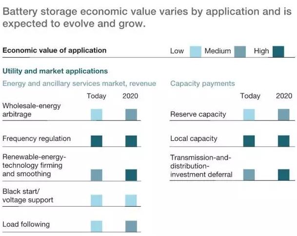 麥肯錫研究發(fā)現(xiàn),對于許多商業(yè)客戶來說,通過儲能設備來降低他們高峰時期的電力需求量已經是經濟可行的了。在現(xiàn)今電價較低的情況下,儲能開始在能源市場上發(fā)揮更廣泛的作用,并從電網平衡等利基市場轉變?yōu)楦鼜V泛的應用,如替代傳統(tǒng)發(fā)電機提高供電可靠性和穩(wěn)定性,支持可再生能源并網整合等。