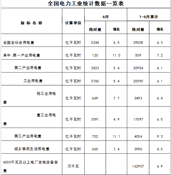 橙電網(wǎng)售電網(wǎng)在國家能源局官網(wǎng)獲悉,1-6月份全國電力工業(yè)統(tǒng)計數(shù)據(jù)發(fā)布,1-6月全國全社會用電量29508億千瓦時,同比增長6.3%。全國售電量23595億千瓦時,同比增長6.9%