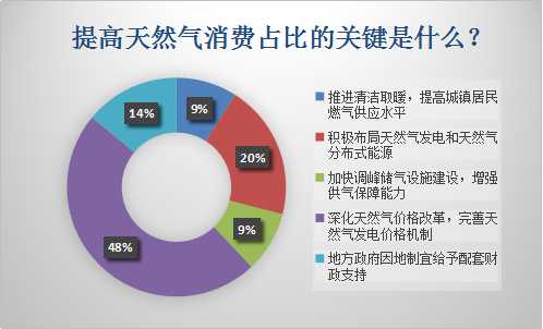 9%的受訪者認(rèn)為,應(yīng)當(dāng)推進(jìn)清潔取暖,提高城鎮(zhèn)居民燃?xì)夤?yīng)水平;幾乎同比例受訪人群認(rèn)為,加快調(diào)峰儲(chǔ)氣設(shè)施建設(shè),增強(qiáng)供氣保障能力;14%的受訪者認(rèn)為地方政府因地制宜給予配套財(cái)政支持;20%的受訪者認(rèn)為應(yīng)該積極布局天然氣發(fā)電和天然氣分布式能源;48%的受訪者認(rèn)為應(yīng)當(dāng)深化天然氣價(jià)格改革,完善天然氣發(fā)電價(jià)格機(jī)制。