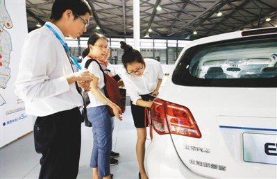 8月3日,2017全球新能源汽車大會(huì)未來汽車展在上海新國(guó)際博覽中心開幕,國(guó)內(nèi)外新能源汽車生產(chǎn)、租賃以及配套電池等方面近40家企業(yè)參展,集中展示純電動(dòng)汽車整車、制造技術(shù)以及電動(dòng)車前沿科技。圖為工作人員向參觀者介紹一款電動(dòng)汽車充電指標(biāo)