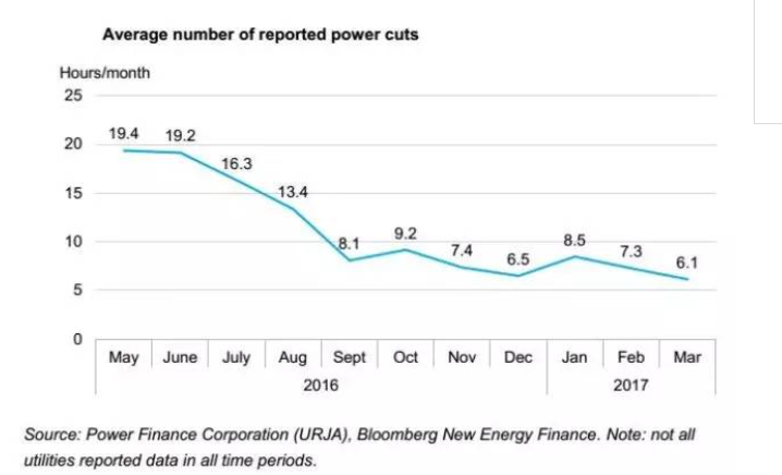 從2016年開始,印度政府提升了電網(wǎng)數(shù)據(jù)的透明度。如今,盡管大多數(shù)的停電已經(jīng)少于平均每天6小時,依然有480萬生活在城鎮(zhèn)、被統(tǒng)計到的印度人在忍受著超過平均每天6小時的停電。