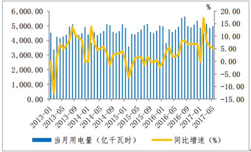 2017年5月全社會(huì)用電量4968億千瓦時(shí),同比增長(zhǎng)5.1%,較去年同期增速提高3.05個(gè)百分點(diǎn)。全社會(huì)累計(jì)用電量24263億千瓦時(shí),同比增長(zhǎng)6.4%,較去年同期增速提高3.6個(gè)百分點(diǎn)。
