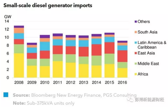 2016年,視在功率低于375kVA的柴油發(fā)電機(jī)在非洲和中東的銷量下降了25%,但可再生能源并沒有與其形成強(qiáng)烈的競(jìng)爭(zhēng),不足以解釋這種驟降。根據(jù)最近一期目前獲得的完整數(shù)據(jù)顯示,大品牌的可移動(dòng)太陽(yáng)能電池包市場(chǎng)在2016年下半年縮水8%。