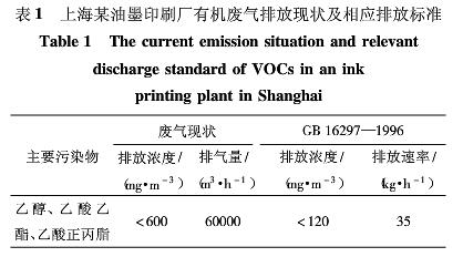 該印刷廠有機(jī)廢氣排放現(xiàn)狀及GB16297—1996《大氣污染綜合排放標(biāo)準(zhǔn)》中的二級排放標(biāo)準(zhǔn)(新建擴(kuò)改項(xiàng)目)要求如表1。