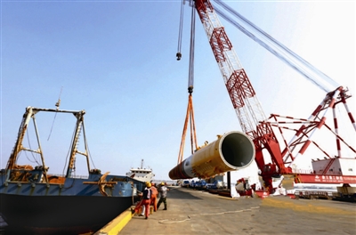 8月11日,投資12億元由江蘇長(zhǎng)鑫龍海上裝備公司自主研發(fā)并生產(chǎn)的首套36根鋼管樁,通過江蘇大豐港直運(yùn)如東海上風(fēng)電工地。圖為吊裝鋼管樁現(xiàn)場(chǎng)
