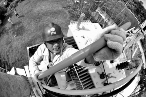 供電員工在陡山村1號(hào)配變臺(tái)架上作業(yè)。張友情攝“用電鍋爐取代燃煤鍋爐,單件羊毛衫成本雖然貴了5分錢,熨燙效率和產(chǎn)量卻提高了20%,而且更加安全環(huán)保