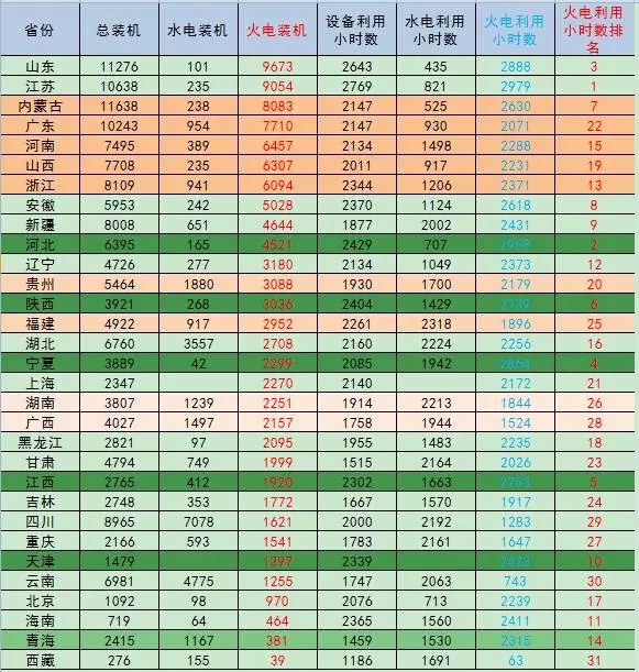 綜合各省火電裝機排名以及火電利用小時排名情況,作出以下判斷:
