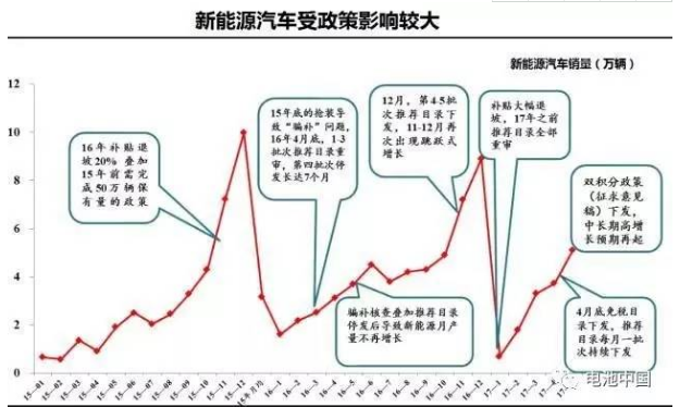 從整個(gè)產(chǎn)業(yè)鏈的角度來(lái)看,鋰電池的上游新能源汽車,受到政策影響非常大。具體來(lái)看,新能源汽車產(chǎn)銷量每次的提升,都伴隨著推薦目錄等政策刺激。