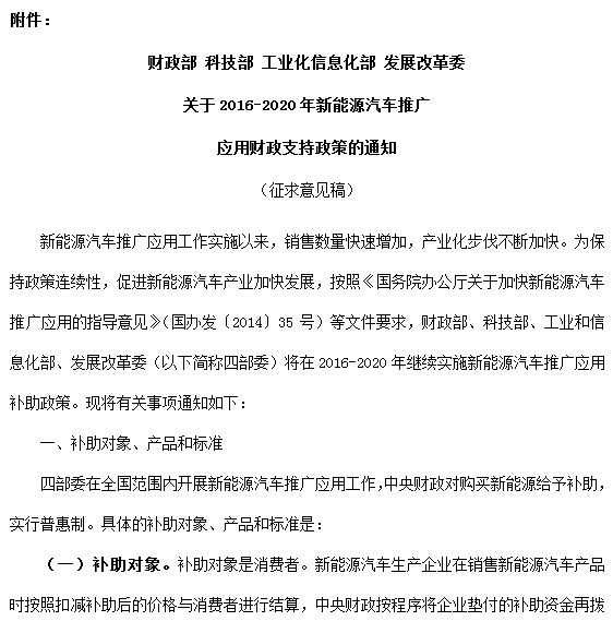 新能源汽車推廣應(yīng)用工作實(shí)施以來(lái),銷售數(shù)量快速增加,產(chǎn)業(yè)化步伐不斷加快。為保持政策連續(xù)性,加快新能源汽車產(chǎn)業(yè)發(fā)展,按照《國(guó)務(wù)院辦公廳關(guān)于加快新能源汽車推廣應(yīng)用的指導(dǎo)意見》(國(guó)辦發(fā)〔2014〕35號(hào))等文件要求,財(cái)政部、科技部、工業(yè)和信息化部、發(fā)展改革委研究起草了2016-2020年新能源汽車推廣應(yīng)用財(cái)政支持政策方案(附后)?,F(xiàn)予以公示。公示期為2014年12月30日-2015年1月30日。如有意見和建議,請(qǐng)以書面(個(gè)人需屬實(shí)名,單位需加蓋公章,并留聯(lián)系方式)形式進(jìn)行反饋。