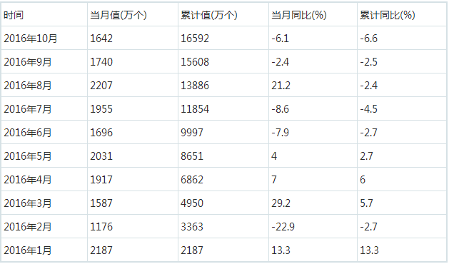 前瞻產業(yè)研究院數(shù)據(jù)顯示,2016年10月全國鉛酸蓄電池出口量為1642萬個,同比下降6.1%。1-10月累計出口量為16592萬個,同比下降6.6%