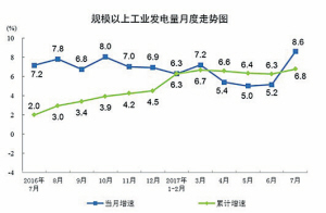 核能、風力和太陽能發(fā)電保持兩位數(shù)增長。7月份,核能、風力和太陽能發(fā)電繼續(xù)保持較快增長,同比分別增長16.5%、11.6%和26.7%,核電增速比6月份加快5.6個百分點,風電回落1.7個百分點,太陽能發(fā)電回落2.6個百分點。