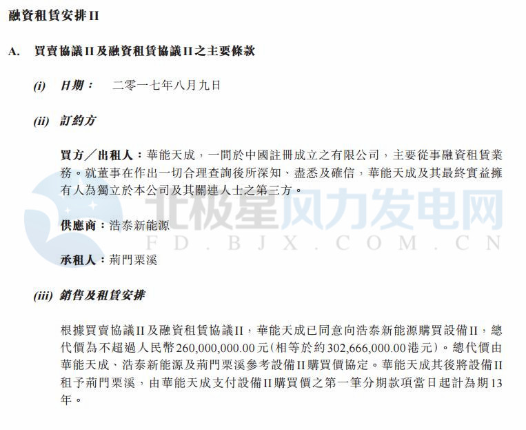 據(jù)悉,荊門栗溪應向華能天成支付金額為1040萬元(10,400,000.00元)的保證金;協(xié)合風電(協(xié)合新能源之全資附屬公司及荊門栗溪之直接股東)以華能天成為受益人訂立股份質(zhì)押協(xié)議II,據(jù)此,協(xié)合風電同意以其于荊門栗溪之全部股權(包括(其中包括)任何已宣派的股息)向華能天成提供質(zhì)押,以擔保荊門栗溪在融資租賃協(xié)議II項下的義務,包括總租賃款項及應付華能天成的其他金額。