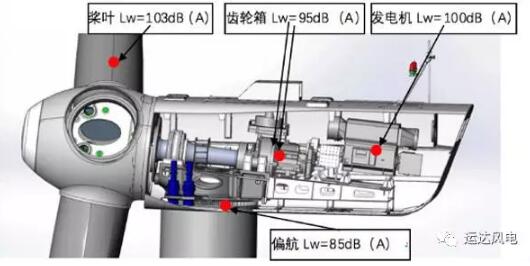 風(fēng)電機(jī)組噪音行程原因風(fēng)力發(fā)電機(jī)組噪聲源有槳葉噪聲及艙內(nèi)噪聲,艙內(nèi)噪聲包括齒輪箱噪聲、發(fā)電機(jī)噪聲、偏航系統(tǒng)噪聲等(見(jiàn)圖1)。由于齒輪箱、發(fā)電機(jī)等噪聲源位于機(jī)艙罩內(nèi),機(jī)艙罩具很強(qiáng)的隔聲吸聲性能,而槳葉完全暴露在空氣中,所以對(duì)風(fēng)電場(chǎng)居民的噪聲干擾,槳葉噪聲占據(jù)主導(dǎo)。