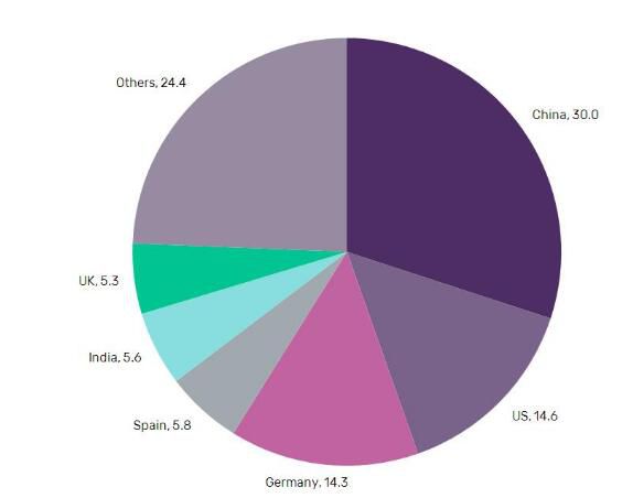 截至2016年,中國成為全球最大的風(fēng)力渦輪機(jī)市場,占全球市場份額的30%。預(yù)計(jì)到2025年,中國仍將保持第一位,占27.4%。其次,美國是全球第二大風(fēng)力發(fā)電市場,2016年全球市場份額的14.6%,預(yù)計(jì)到2025年還將繼續(xù)保持第二。此外,作為歐洲最大的風(fēng)電市場,德國在2016年占據(jù)了14.3%的市場份額,預(yù)計(jì)2025年將減少到11.9%的份額。預(yù)計(jì)印度2025將由2016年5.6%的市場份額增長到6.4%。最后,英國的份額預(yù)計(jì)將從2016年的5.3%增長到2025年的7.1%。