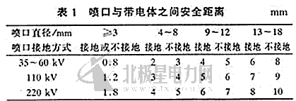 b. 帶電水沖洗人員保安措施保證帶電水沖洗人員的人身安全是開展帶電水沖洗作業(yè)的前提。 首先要遵循帶電作業(yè)的一般規(guī)定,穿絕緣靴,帶絕緣手套、安全帽等,有條件的還可以穿防水服裝;其次從使用的工具上要考慮其安全性,使用的水槍、水泵、盛水容器要可靠接地,帶電水沖洗的變電設備接地線要與地網相連,水槍外表要裝設絕緣護套(可使用絕緣熱縮電纜護套);再就是要考慮水柱的絕緣強度,因水沖洗時,主要靠水柱起絕緣作用,水沖洗噴嘴直徑不同,其噴口與帶電體間的安全距離也相應改變,安全距離一般按表1執(zhí)行。