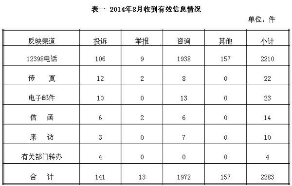 按反映渠道分類,12398電話2210件,傳真22件,電子郵件23件,信函14件,來訪10件, 有關(guān)部門轉(zhuǎn)辦4件。(2014年8月收到有效信息情況見表一)