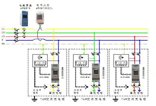 交流充電樁一般功率在7kW左右,總進(jìn)線回路配置電能質(zhì)量分析儀,對(duì)整個(gè)充電樁供電回路電能質(zhì)量進(jìn)行監(jiān)測(cè)。進(jìn)線回路同時(shí)設(shè)置電氣火災(zāi)監(jiān)控裝置。充電樁內(nèi)設(shè)置充電管理控制器,負(fù)責(zé)充電計(jì)費(fèi)控制;單相導(dǎo)軌式交流電能表,用于充電電能計(jì)量,電能數(shù)據(jù)由充電管理控制器通過(guò)RS485通訊口讀?。贿M(jìn)線側(cè)配置帶漏電保護(hù)斷路器;充電側(cè)配置帶電操微型斷路器等。
