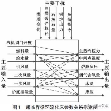 1)熱慣性及遲滯性大、多變量強耦合,超臨界循環(huán)流化床參數(shù)關(guān)系示意圖如圖1所示,與常規(guī)亞臨界循環(huán)流化床鍋爐及普通直流煤粉鍋爐相比,具有更加復雜的控制特性;