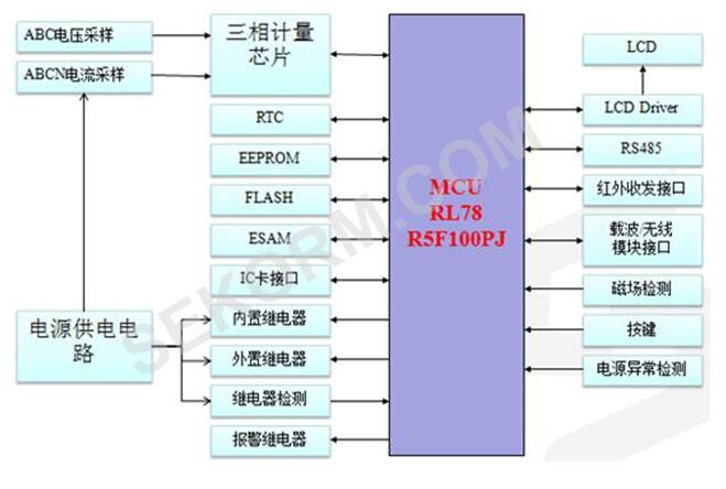 智能電表是智能電網(wǎng)的智能終端,它已經(jīng)不是傳統(tǒng)意義上的電能表,除了具備傳統(tǒng)電能表基本用電量的計(jì)量功能以外,為了適應(yīng)智能電網(wǎng)和新能源的使用,它還具有雙向多費(fèi)率計(jì)量功能、用戶端控制功能、多種數(shù)據(jù)傳輸模式的雙向數(shù)據(jù)通信功能、防竊電功能等智能化的功能,智能電表代表著未來節(jié)能型智能電網(wǎng)最終用戶智能化終端的發(fā)展方向?! ∠聢D1為智能電表應(yīng)用框圖,該方案基于瑞薩的MCU R5F100PJ,符合Q/GDW 1354-2013智能電能表功能規(guī)范、Q/GDW 1356-2013三相智能電能表型式