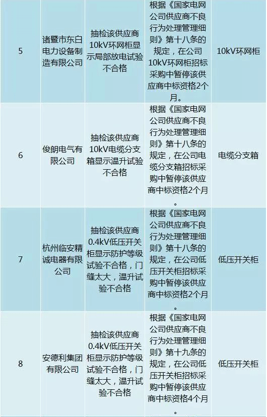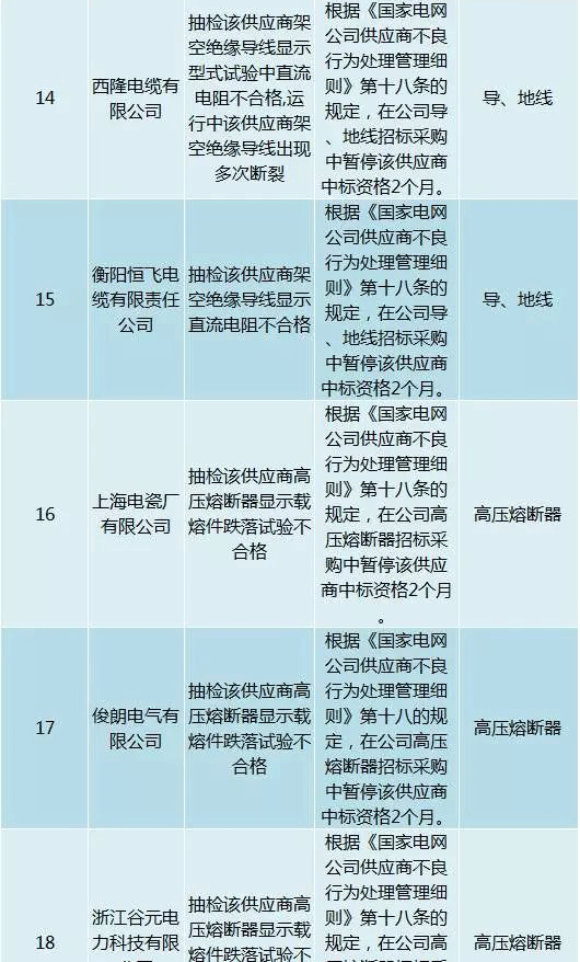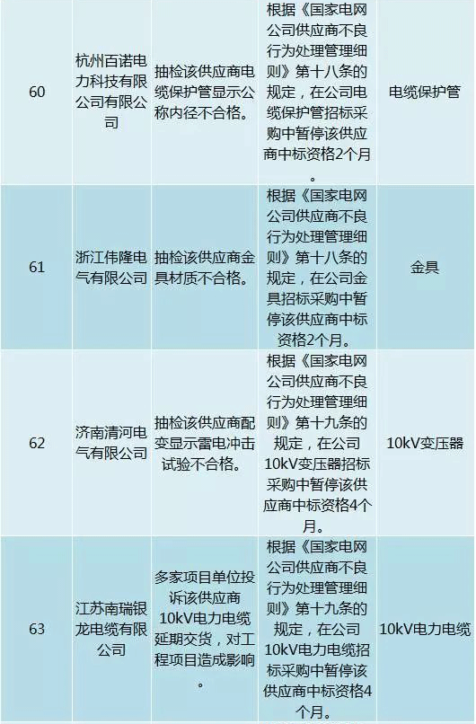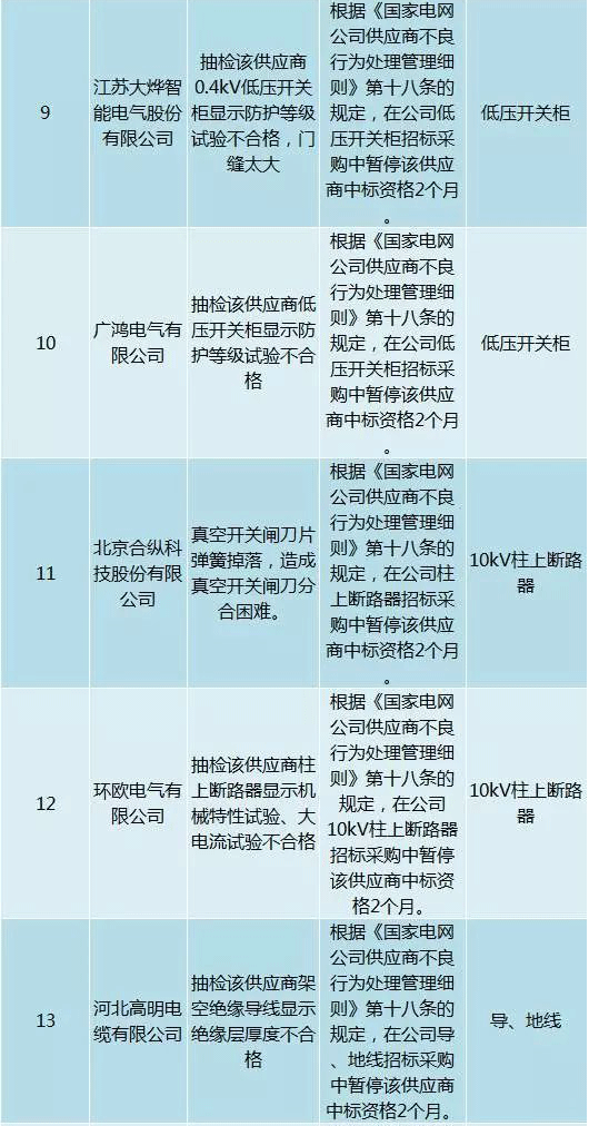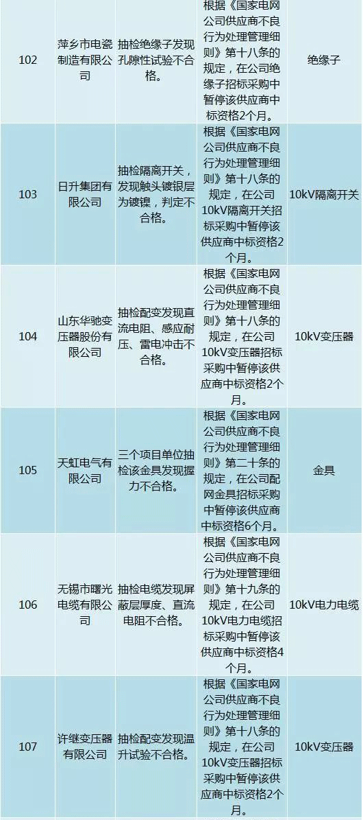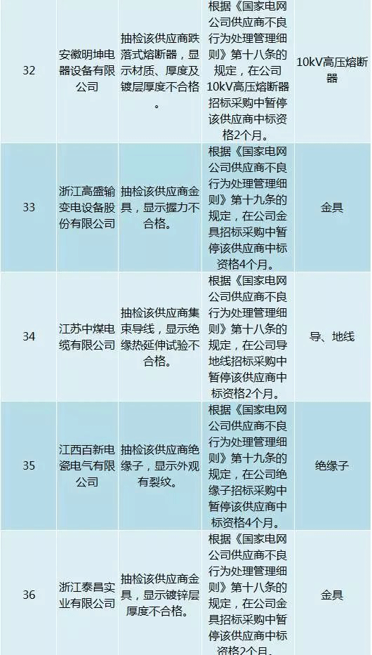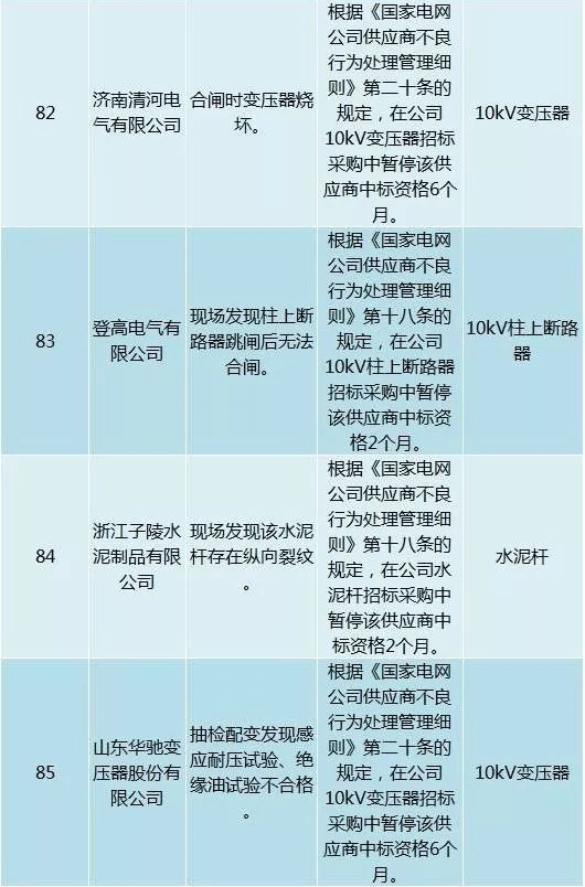 為促進(jìn)供應(yīng)商誠信履約,保證產(chǎn)品質(zhì)量,確保電網(wǎng)建設(shè)順利進(jìn)行及安全可靠供電,依據(jù)《國家電網(wǎng)公司供應(yīng)商不良行為處理管理細(xì)則》(以下簡稱《細(xì)則》)的有關(guān)規(guī)定,對出現(xiàn)重大產(chǎn)品質(zhì)量問題、履約不誠信等問題的供應(yīng)商進(jìn)行了處理。本次處理涉及10kv變壓器、高壓熔斷器等物資,具體處理情況如下: