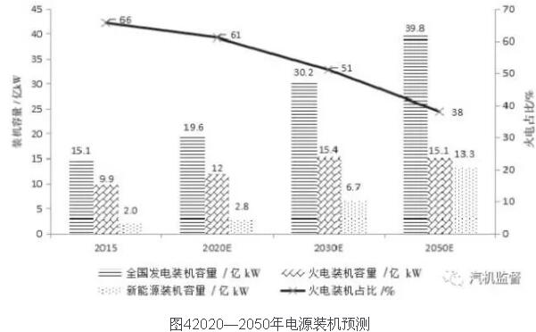 通過發(fā)達國家電源結構變化以及我國未來的能源政策導向的分析, 得出未來我國火電產(chǎn)業(yè)將進入衰退期。根據(jù)中國電力企業(yè)聯(lián)合會預測, 2020年、2030年、2050年我國火電產(chǎn)業(yè)發(fā)展情況如圖4所示