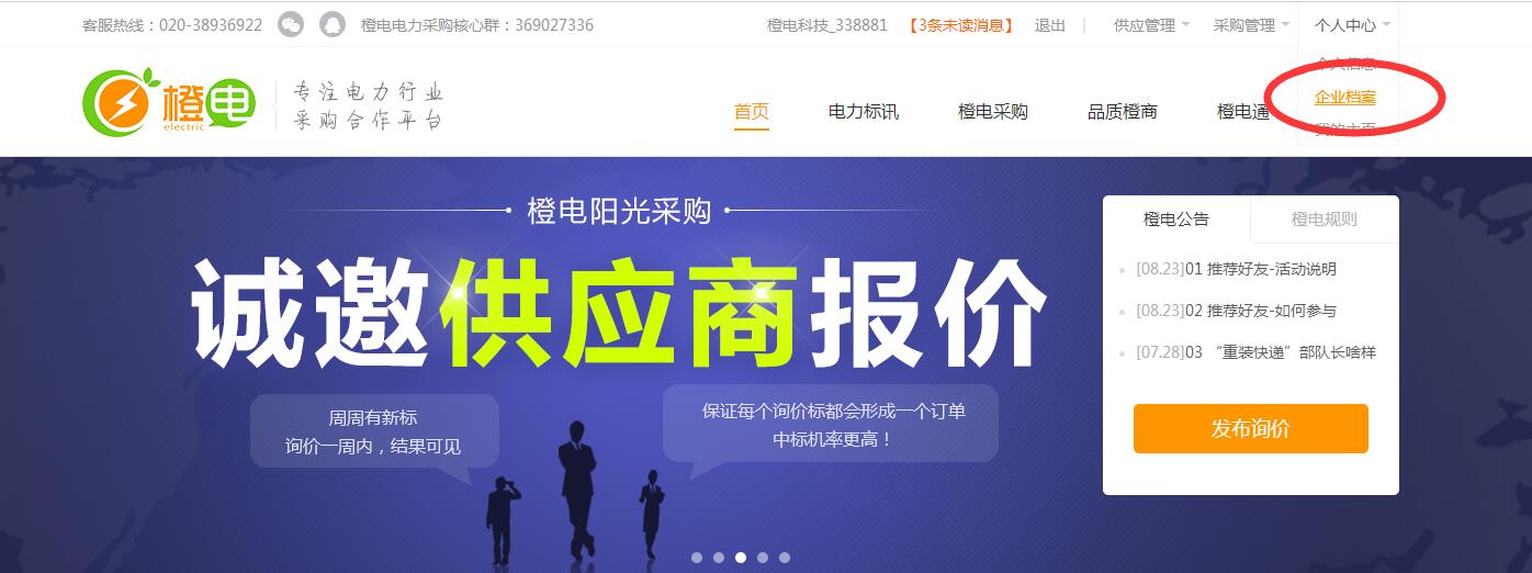 第一步:登陸橙電賬號,點(diǎn)擊在網(wǎng)站右上角【個人中心】—【企業(yè)檔案】