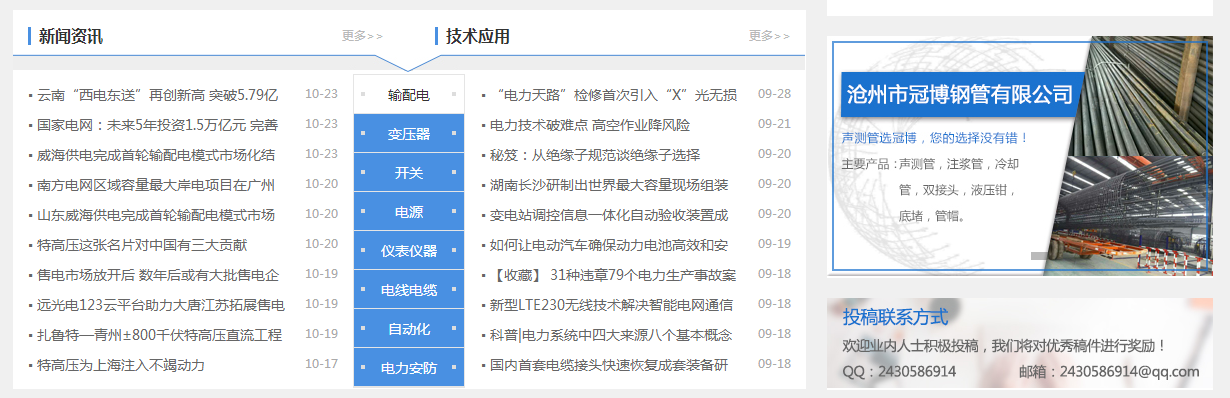 橙電新聞網(wǎng)的電力資訊不僅齊全,而且分類十分清晰。橙電新聞網(wǎng)對資訊內(nèi)容分為七大分類,分別為“電力行業(yè)資訊”、“電力產(chǎn)品資訊”、“電力建設(shè)”、“電與社會”、“電力企業(yè)動態(tài)”、“用電常識”、“電力企業(yè)違信曝光”。