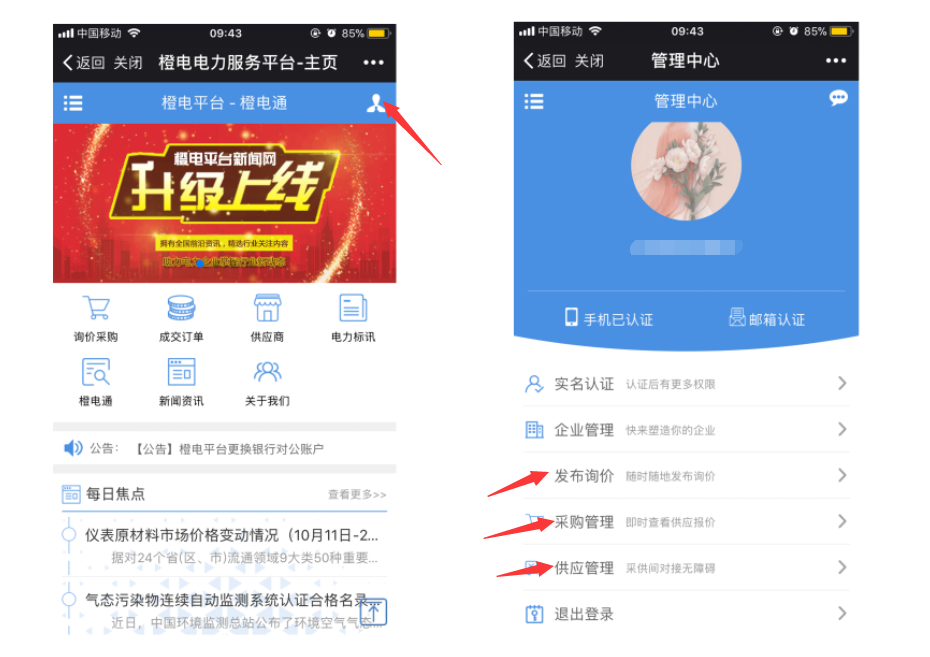 入駐橙電的用戶在手機(jī)訪問橙電官網(wǎng)后進(jìn)入個人中心,即可看到“發(fā)布詢價(jià)”、“采購管理”、“供應(yīng)管理”等功能導(dǎo)航欄。
